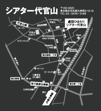 プレゼント・ファンレターなども、劇場ロビーの「プレゼントお預かり」窓口にてお預かりさせて頂き、 スタッフがお客様にかわって出演者にお届け致します。また、ナマモノ・賞味期限が短いもの差し入れはできるだけご遠慮下さい。 プレゼントを直接出演者にお渡し頂くことはできません。あらかじめご了承下さい。 お送り下さる場合は、10月22日(水)~26日(日)の間に劇場に到着するようにお願い致します。 <劇場連絡先>シアター代官山:〒150-0021東京都渋谷区恵比寿西2-12-12/03-3476-0077